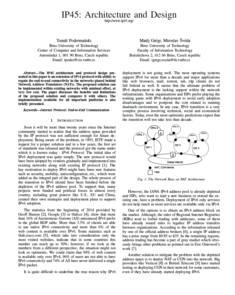 The IP45 is natural extension of IPv4 protocol with ability to regain the end-to-end connectivity in networks place behind Network Address Translators (NATs).